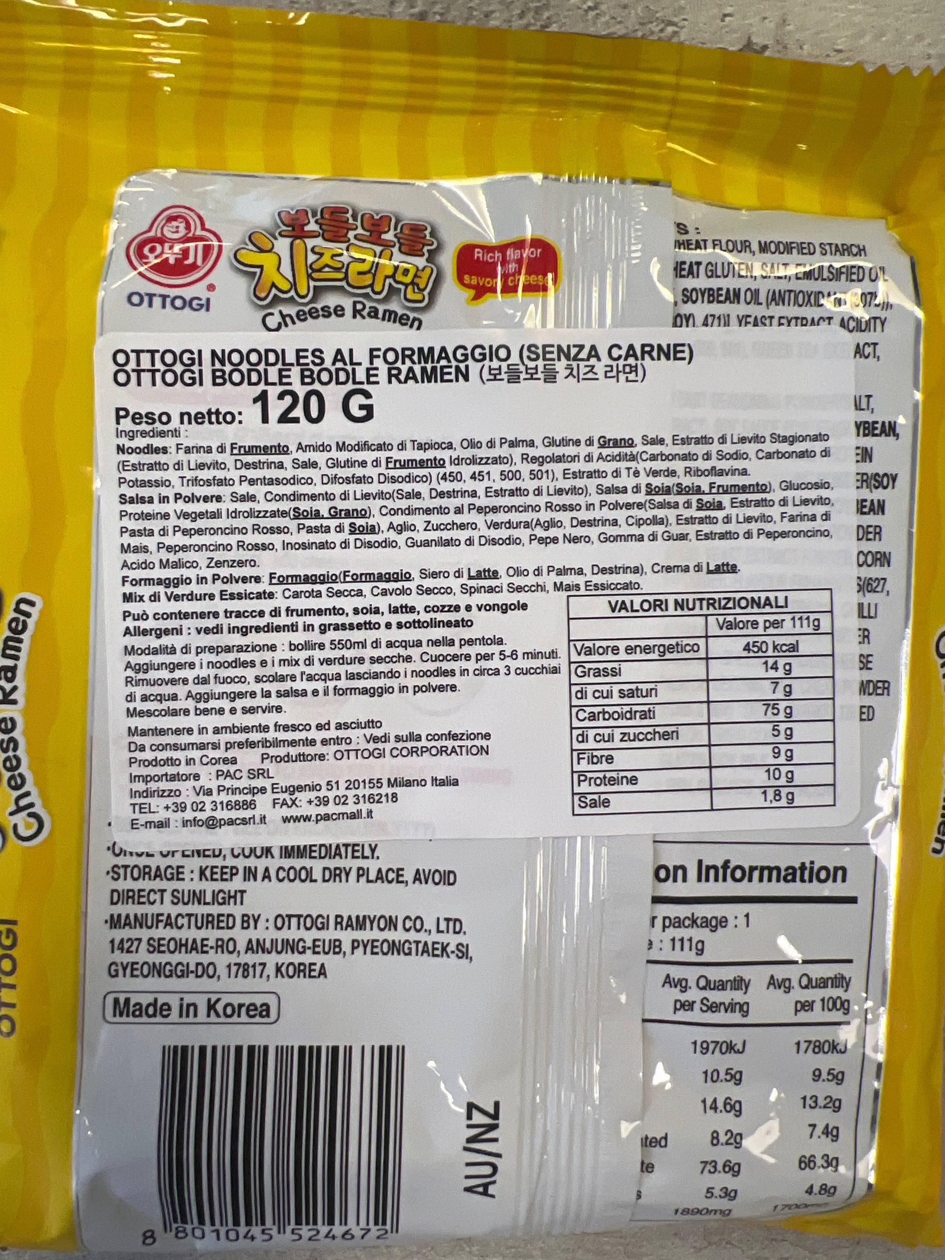 Il Cheese Ramen Ottogi combina il gusto intenso del formaggio con un brodo ricco e leggermente piccante, creando una zuppa cremosa e irresistibile.
