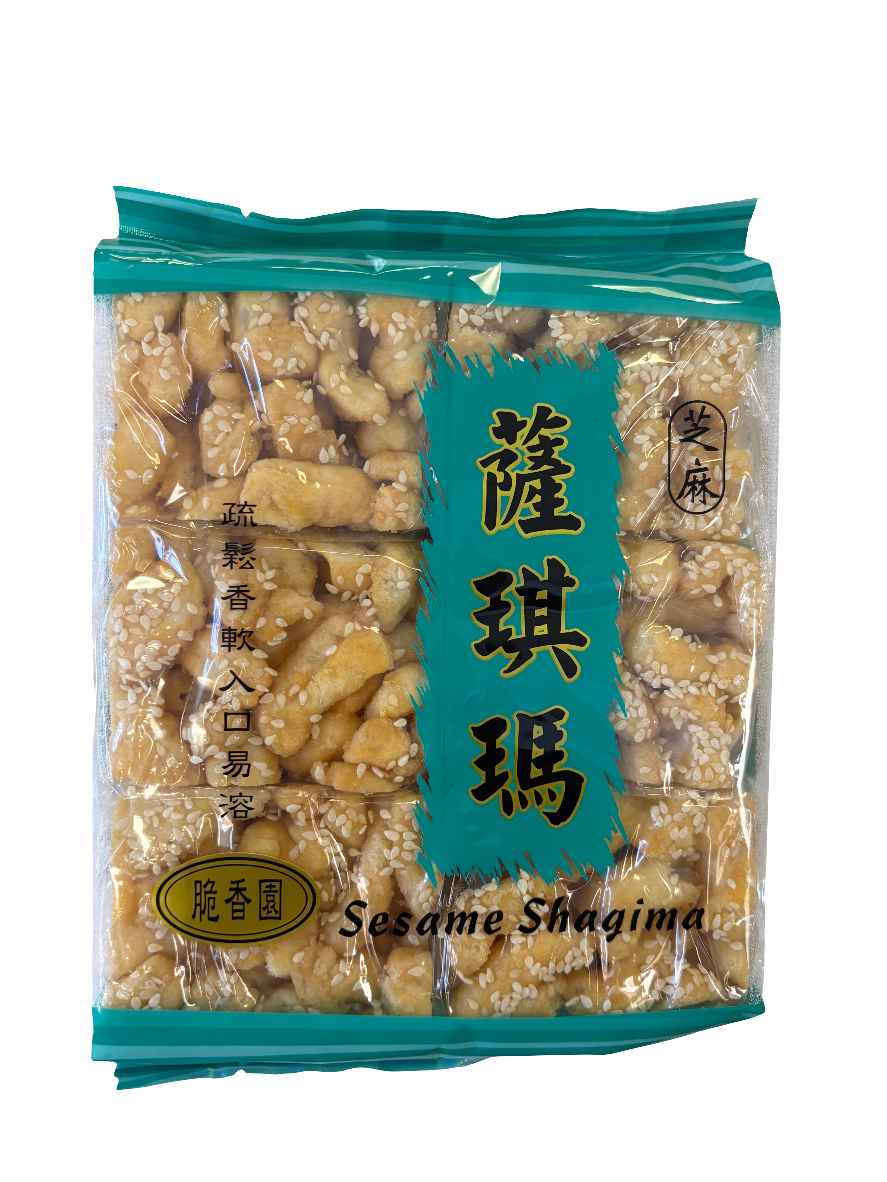 Tradizionali dolcetti cinesi Shaqima, morbidi e dolci con semi di sesamo tostati.
