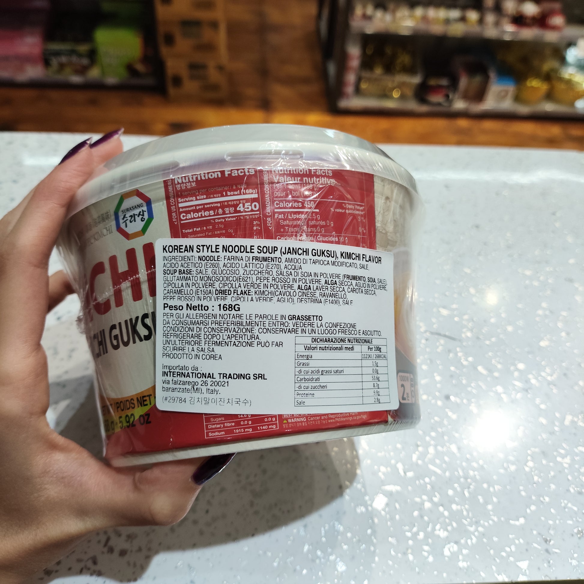 Un delizioso noodle soup coreano a base di kimchi, dal gusto leggermente piccante e fresco, perfetto per ogni stagione.
