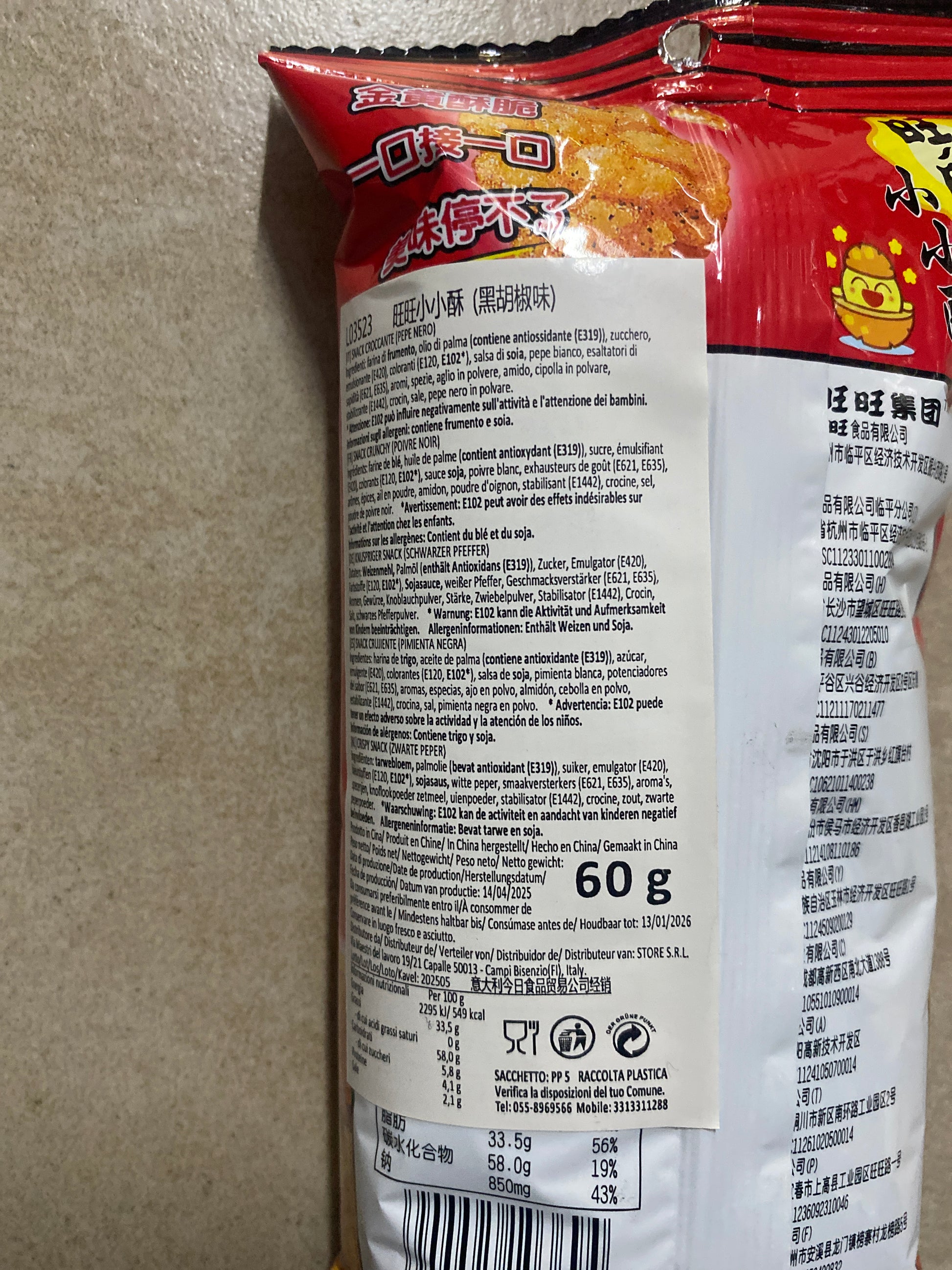Snack iconico della tradizione asiatica, queste perle croccanti Wantwant uniscono una consistenza leggera e scoppiettante a un aroma deciso di pepe nero. Perfette per chi ama gli snack salati con un tocco speziato ma equilibrato.